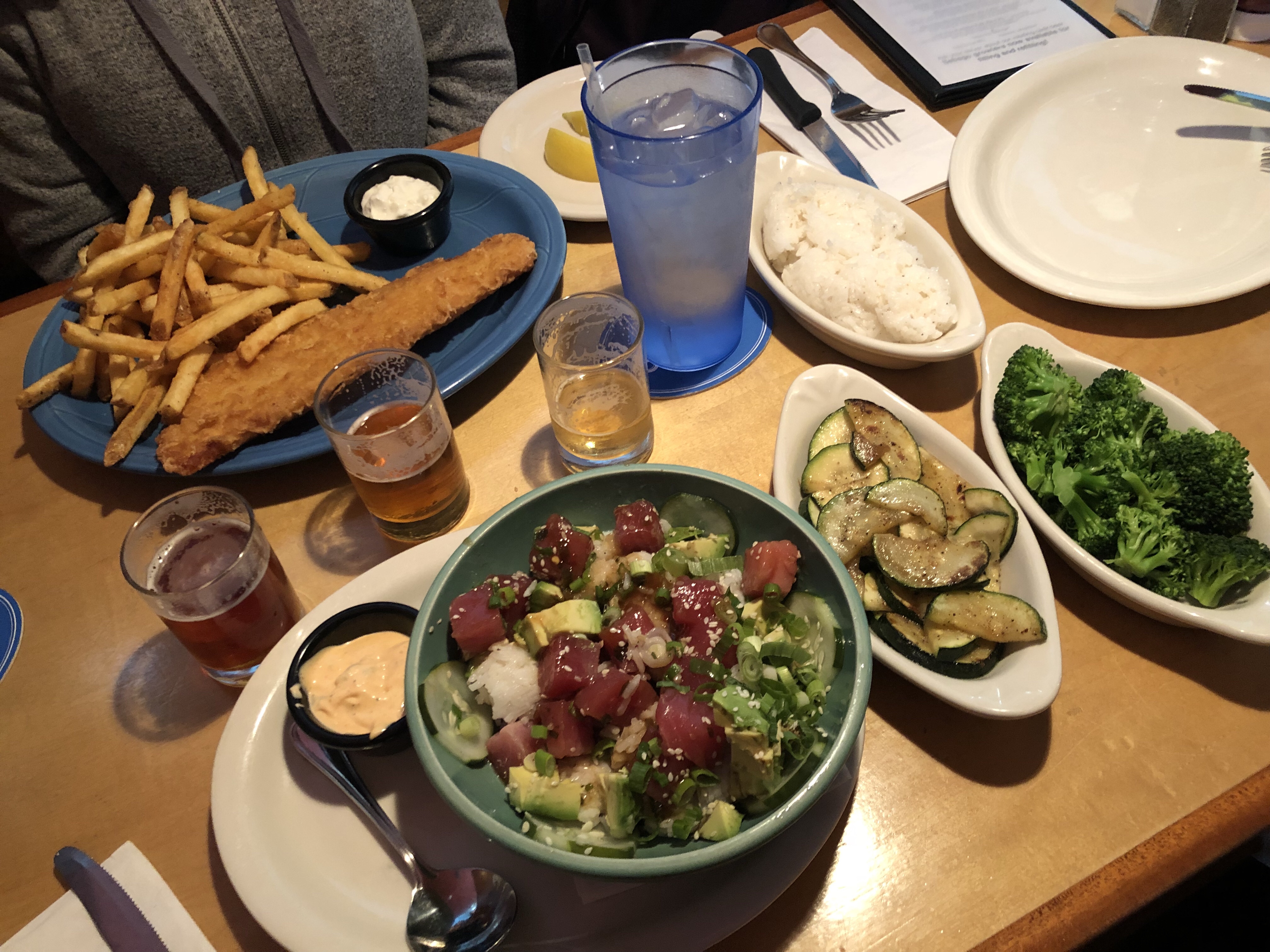 Kayleen had the fish and chips-didn’t realize the fish was singular lol. Angela got broccoli, zucchini, and rice (vegan lol), and I got the tuna poke bowl. All very good!